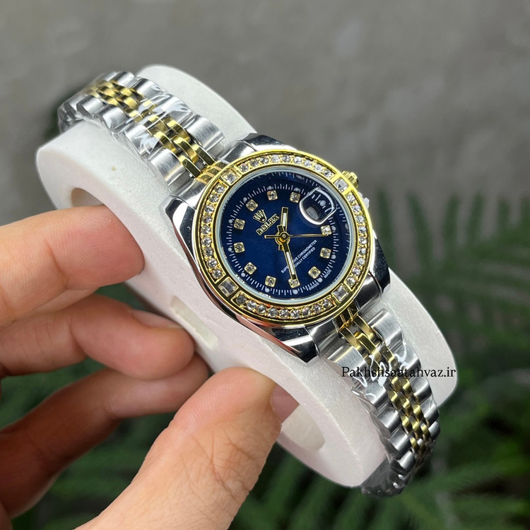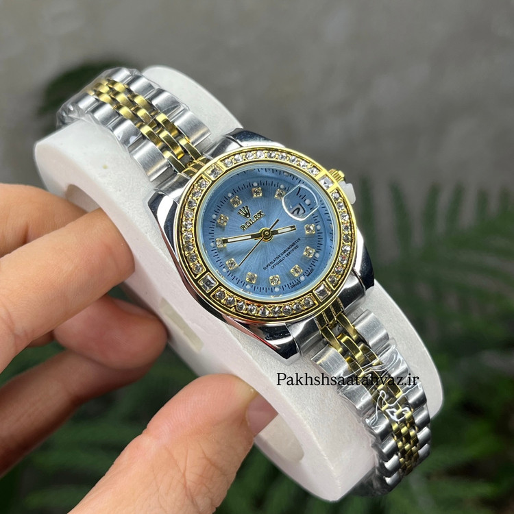 ساعت مچی رولکس مدل نگین دار دو رنگ با بند استیل ضد زنگ